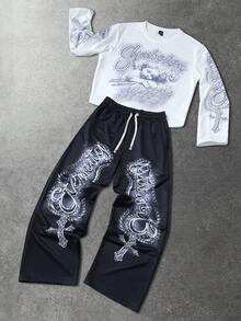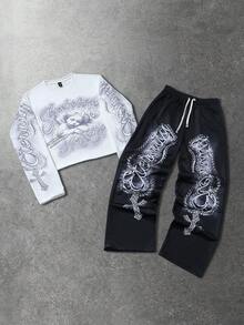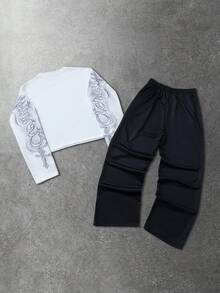 طقم بلوزة رقبة طاقم وبنطلون بطباعة بسيطة للرجال