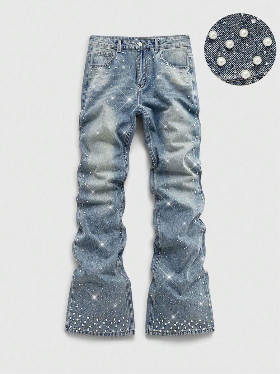 سراويل جينز مزينة بالألماس والخرز اللؤلؤي ذات قصة واسعة للرجال