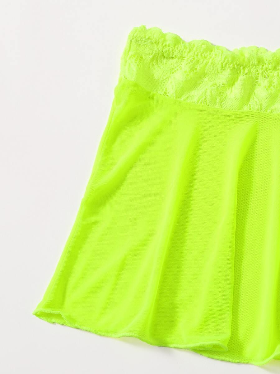 تنورة مطوي مع طقم لانجري ثونغ دانتيل مقلم بلون النيون