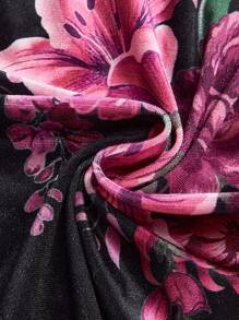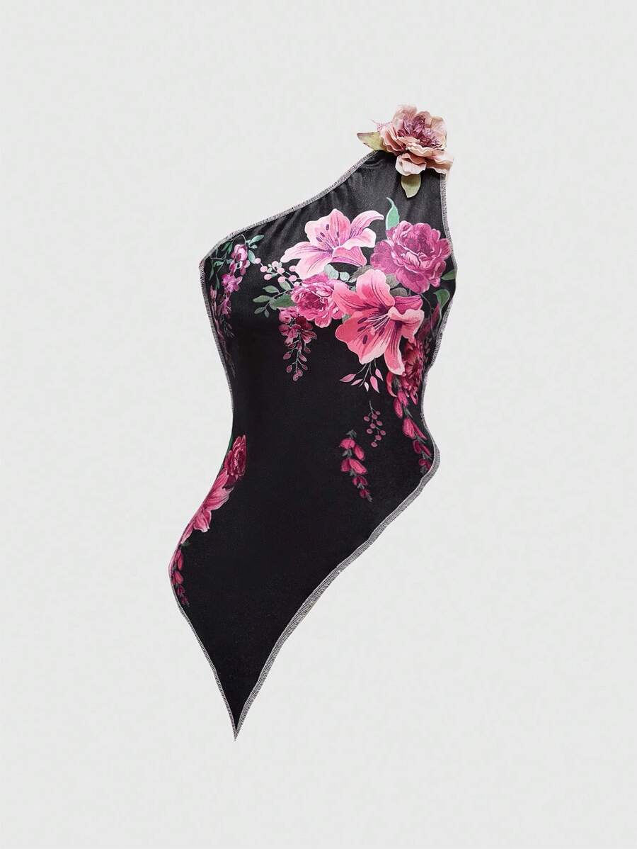 ROMWE Avant ملابس علوية نسائية بطبعة زهرية على الفيلكرو بألوان متباينة وتصميم كتف غير متماثل مع زخرفة زهرة ثلاثية الأبعاد