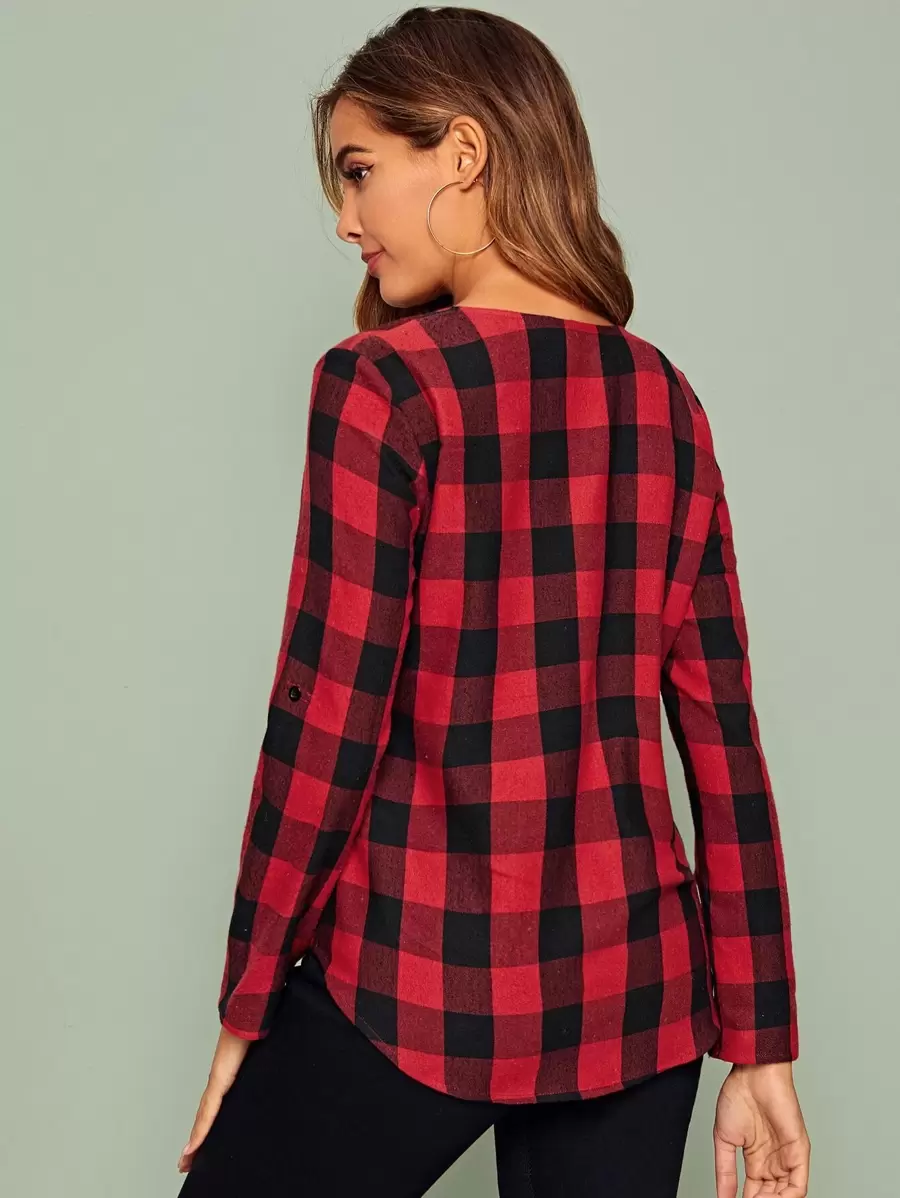 لباس علوي باكمام ملتف وبطباعة مربعات مع عنق مسنن
