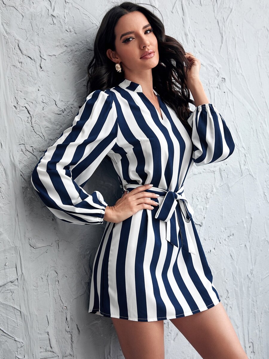 فستان مخطط بحزام وباكمام فانوس بياقة مسنن