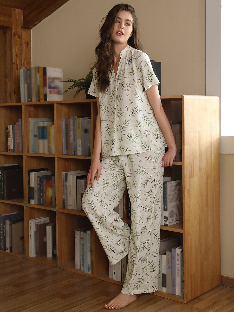 طقم بيجامة بنطلون وتوب برقبة على شكل V وطباعة نباتات