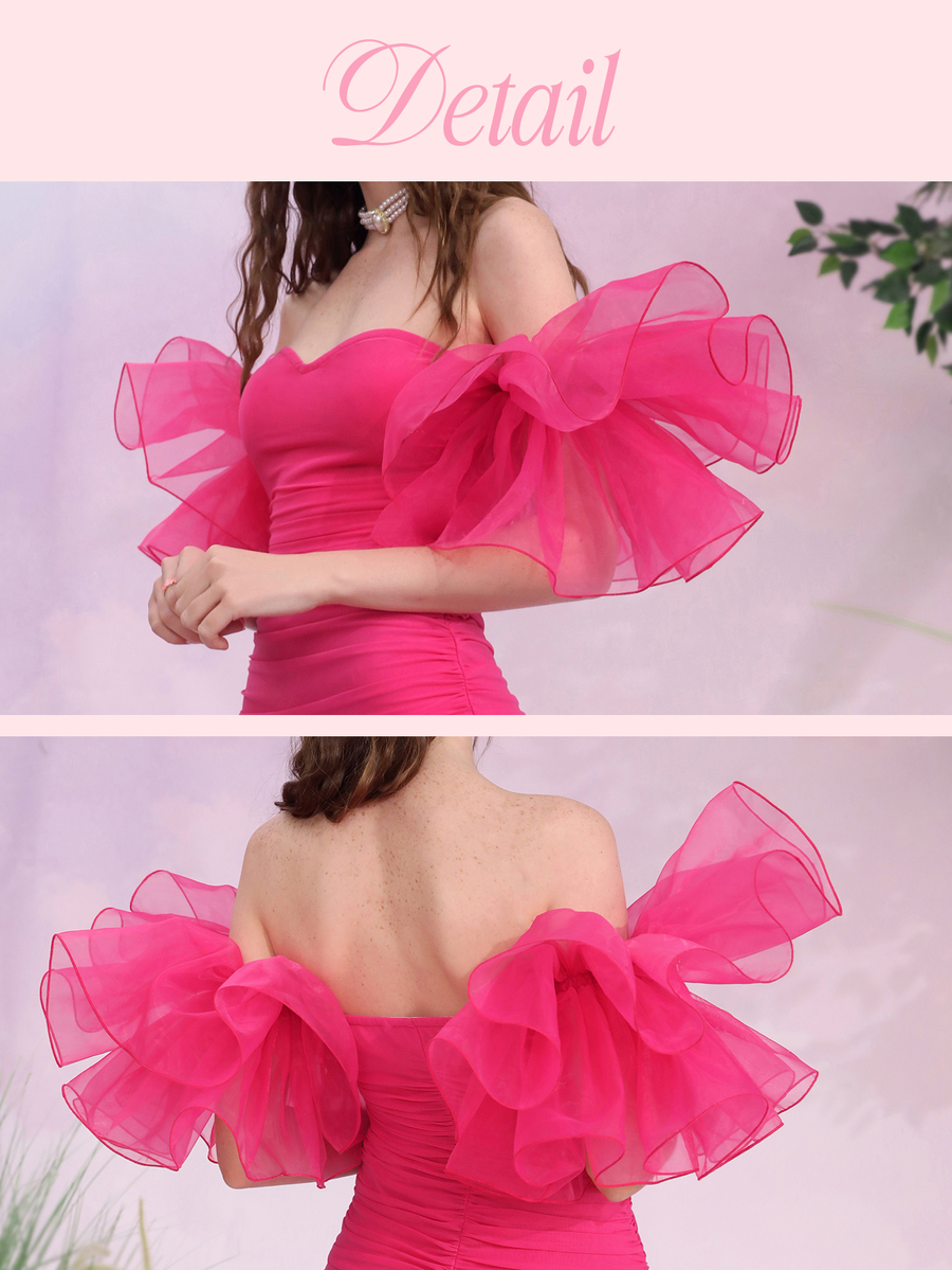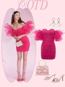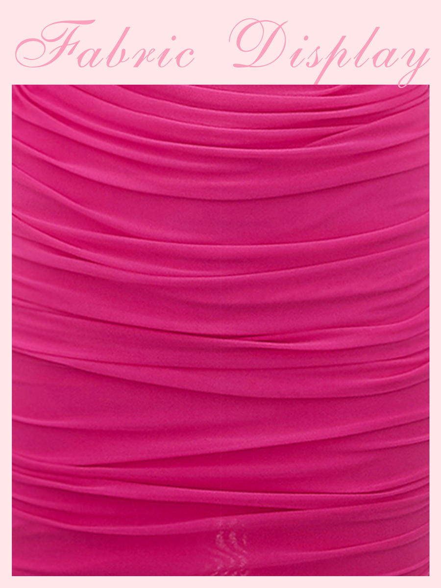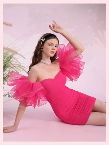 فستان قصير ضيق بالتجاعيد على الكتف الخارج ، منحرف الجسم محشو بالشبكة ، باللون الوردي الغامق