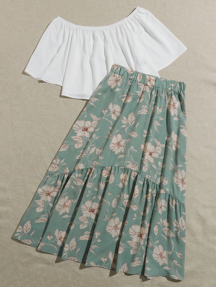 طقم توب سادة بكتف مكشوف وتنورة موردة