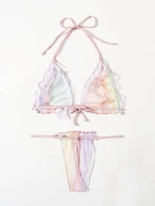 طقم ملابس داخلي مقلم خس شبكي شفاف بلون متدرج