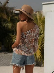 أبلوزة طباعة أزهار وبايزلي ذات كتف واحد، ملابس علوية ذو أكمام طويلة