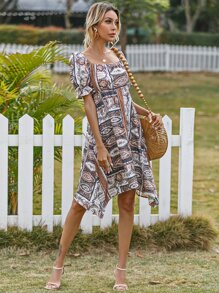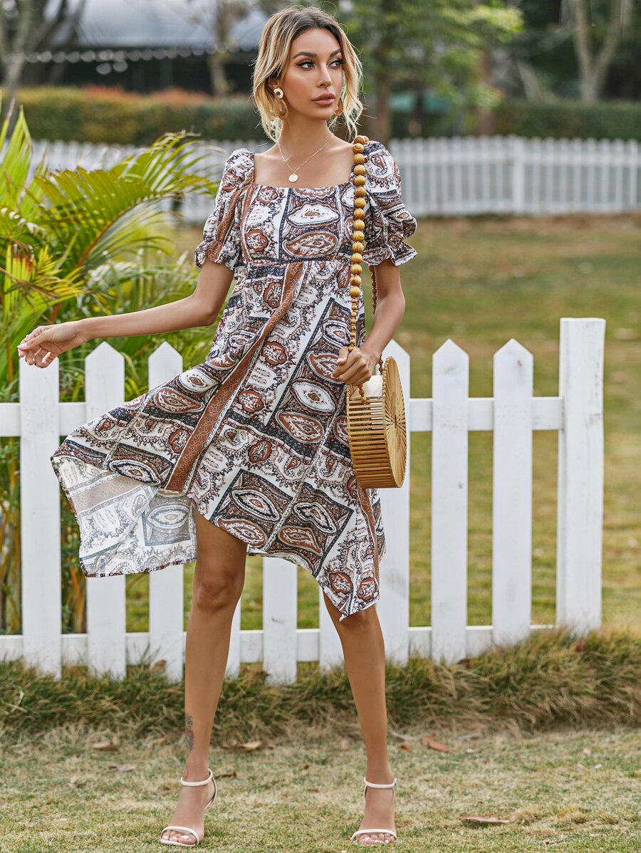 فستان باكمام منتفضة بياقة مربع بطباعة بيزلي