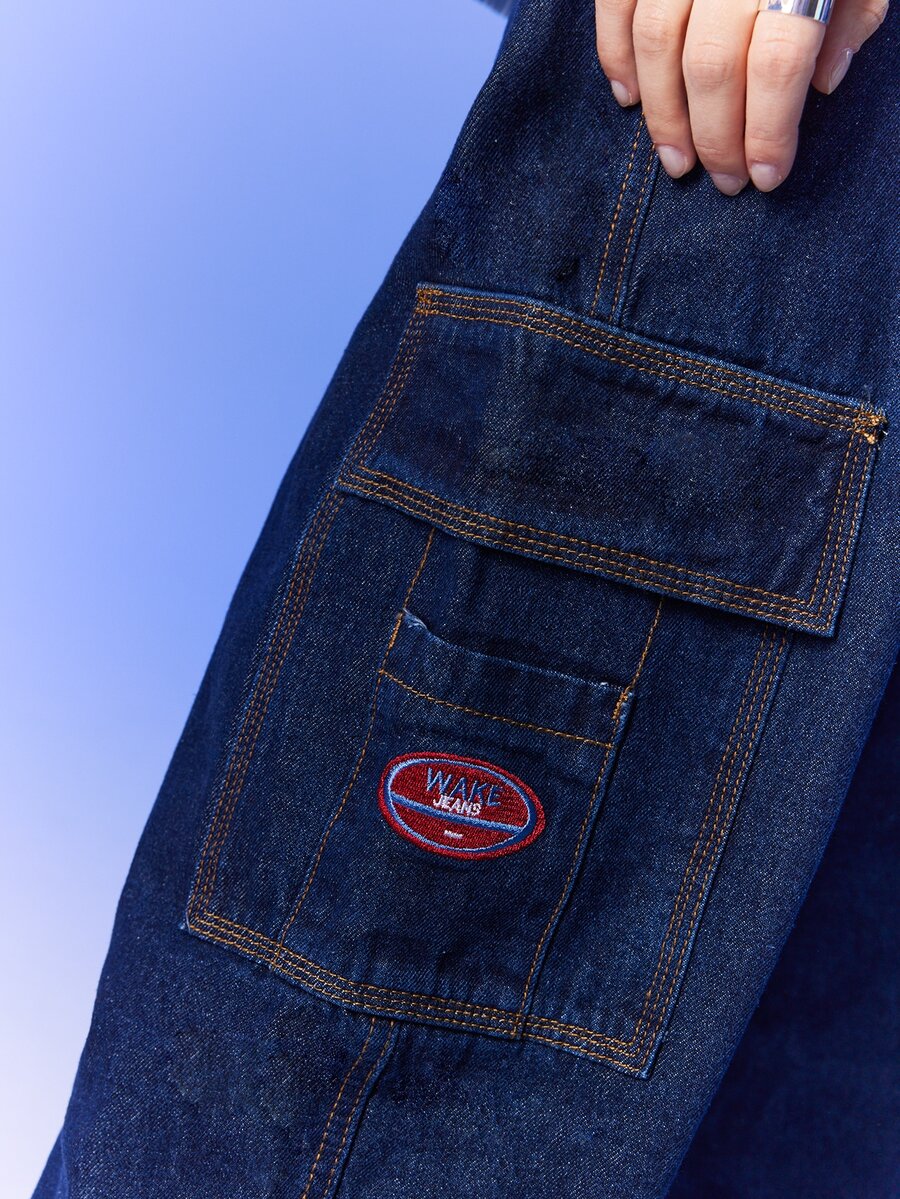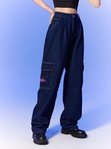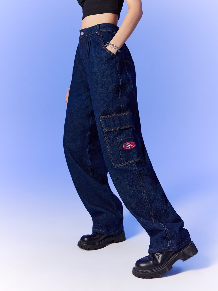 بنطلون جينز بتفاصيل مرقع جيب قلاب ساق عريضة