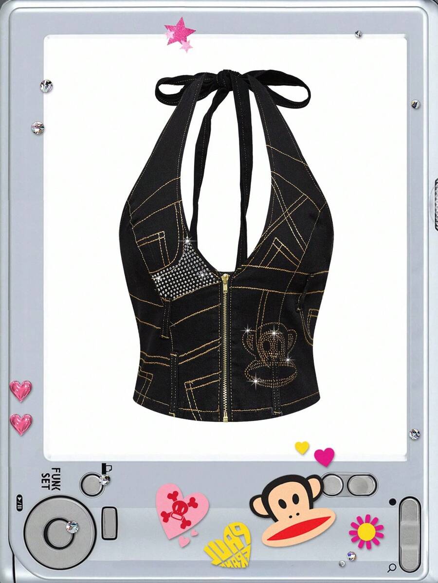 Paul Frank X ROMWE ملابس علوية جينز قصير مزين بنقشة قرد بالراين للنساء من طراز Y2K