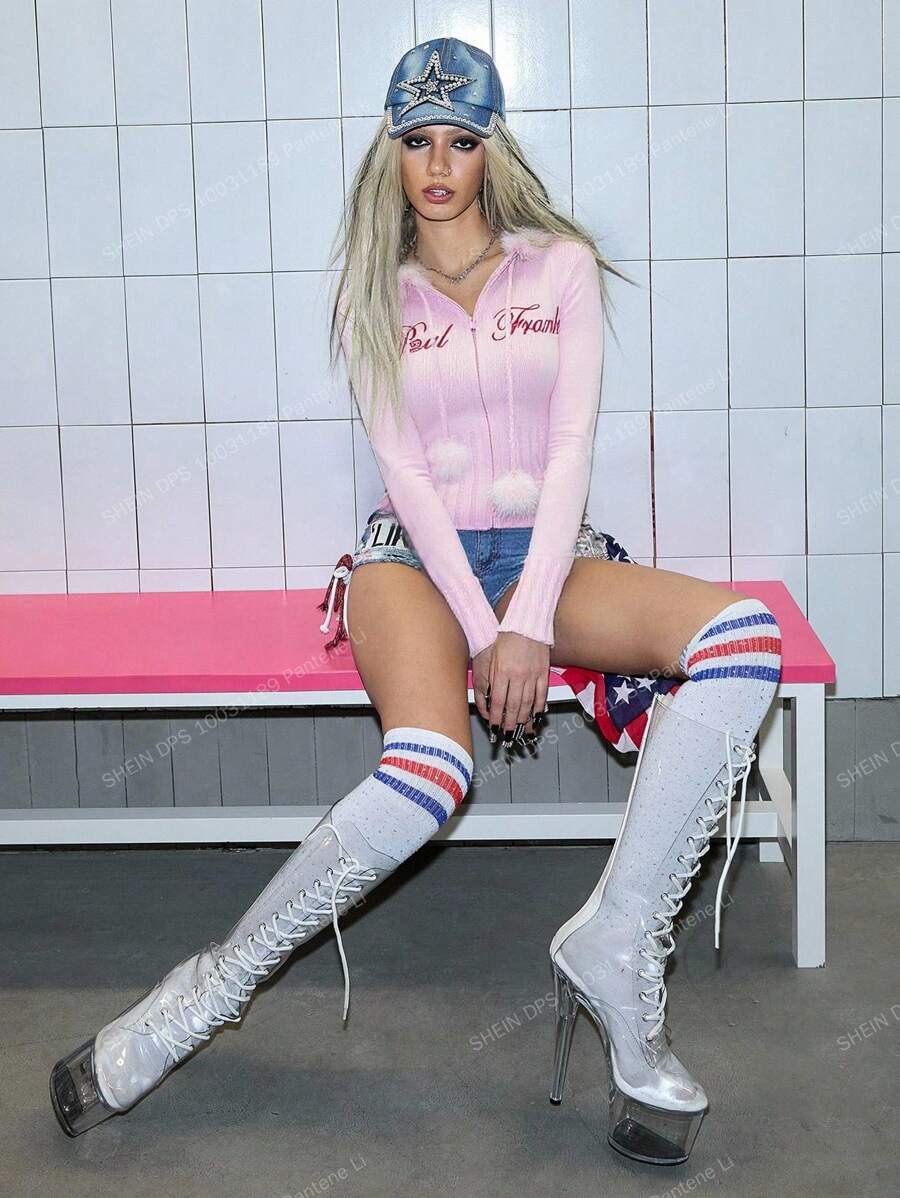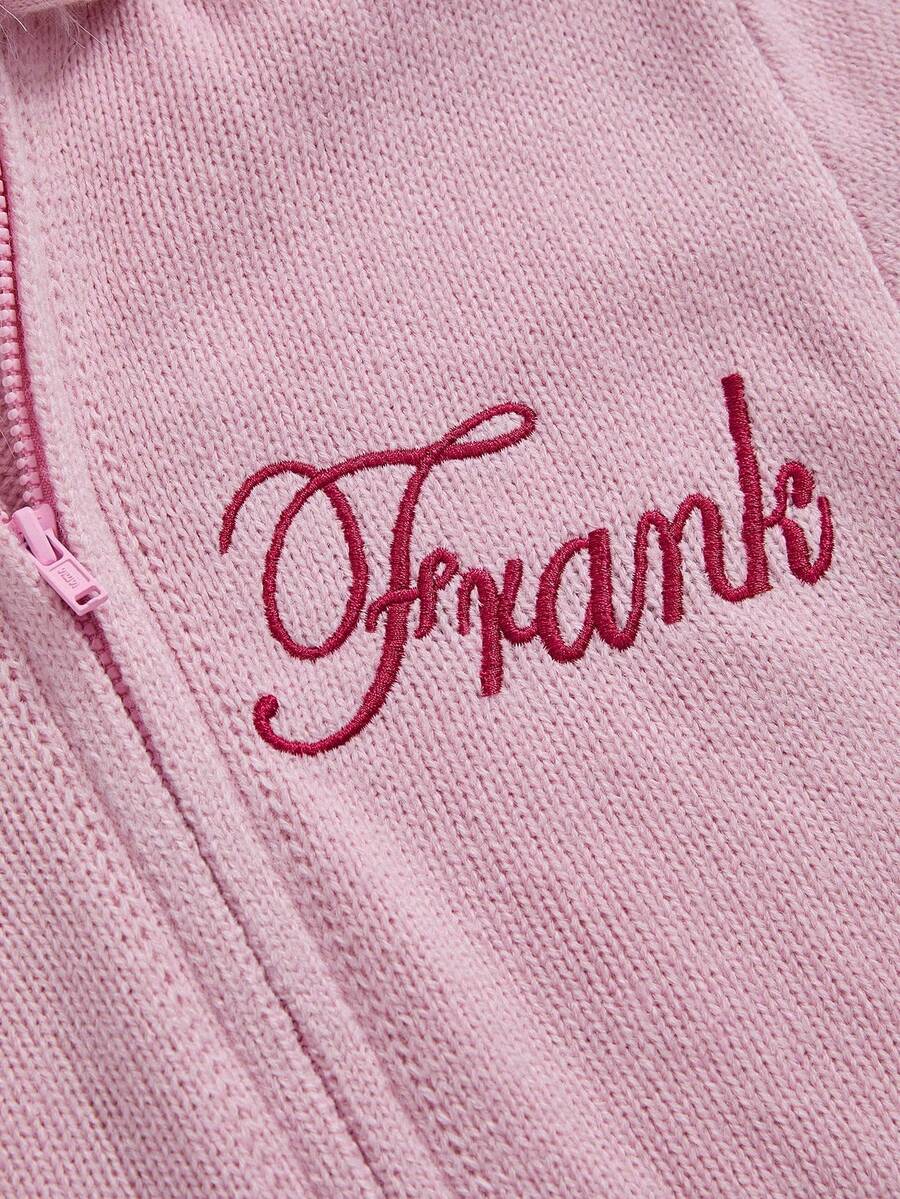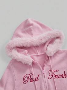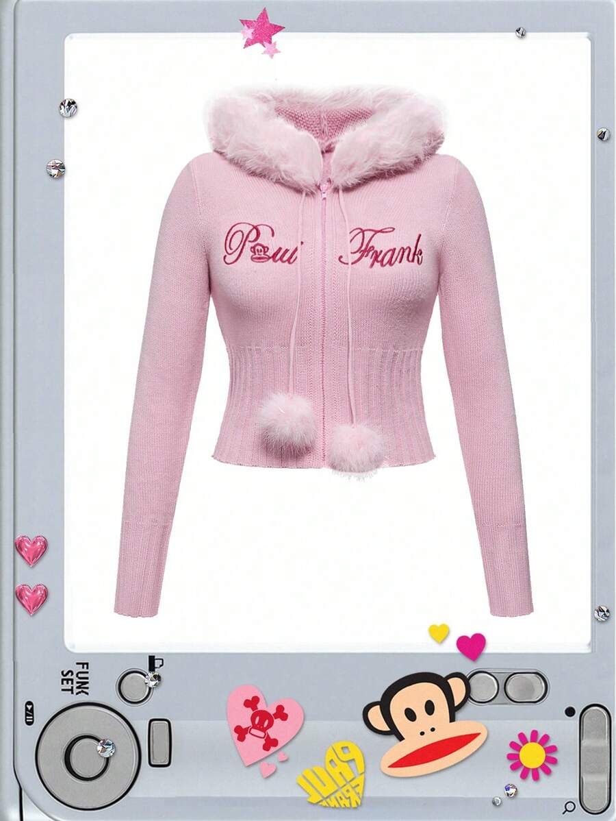Paul Frank X ROMWE كارديجان أنثوي مطرز باللون الوردي مع كرات الفرو على الرأس