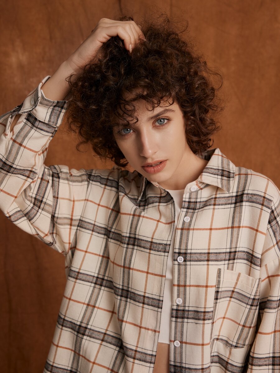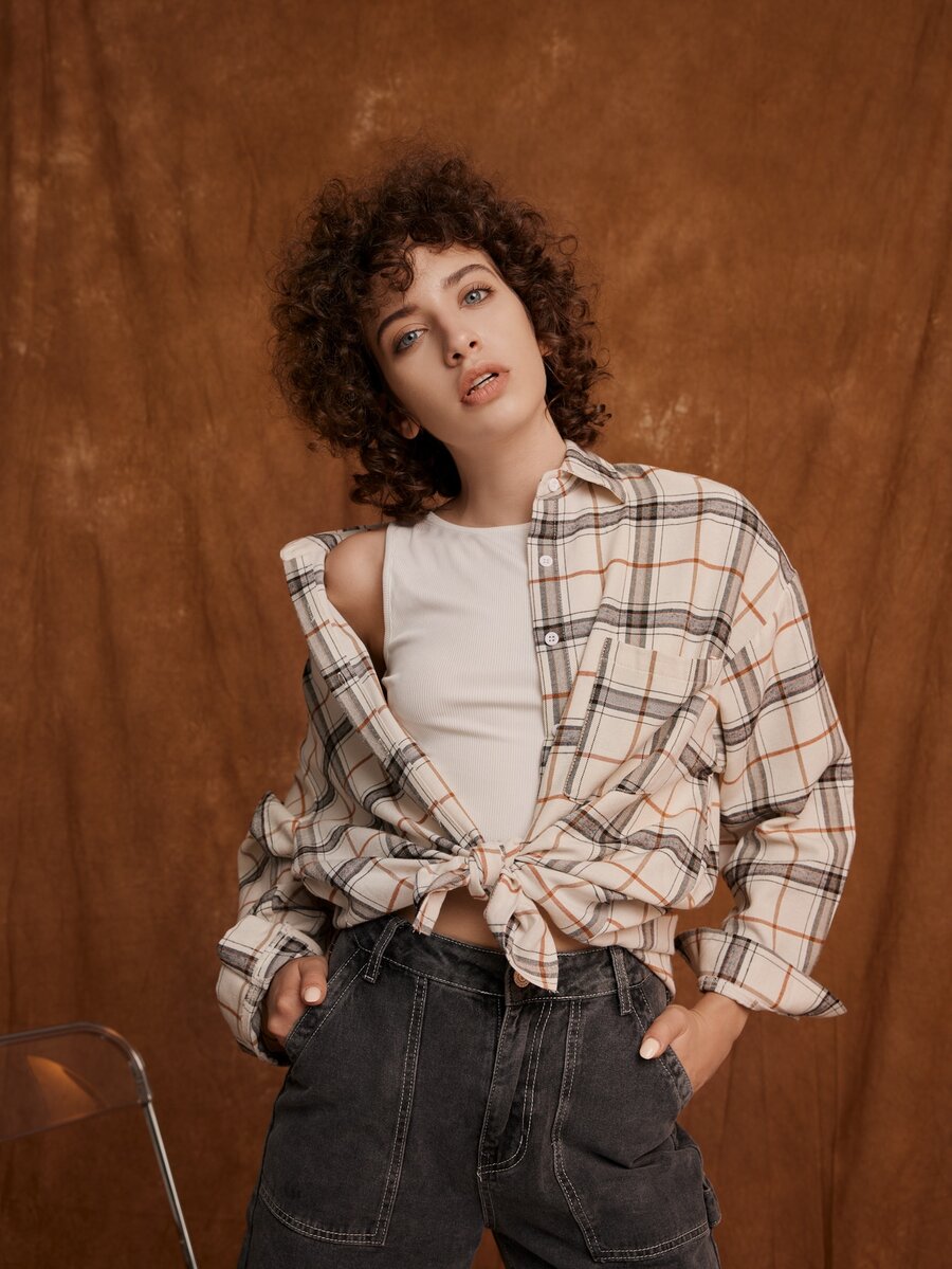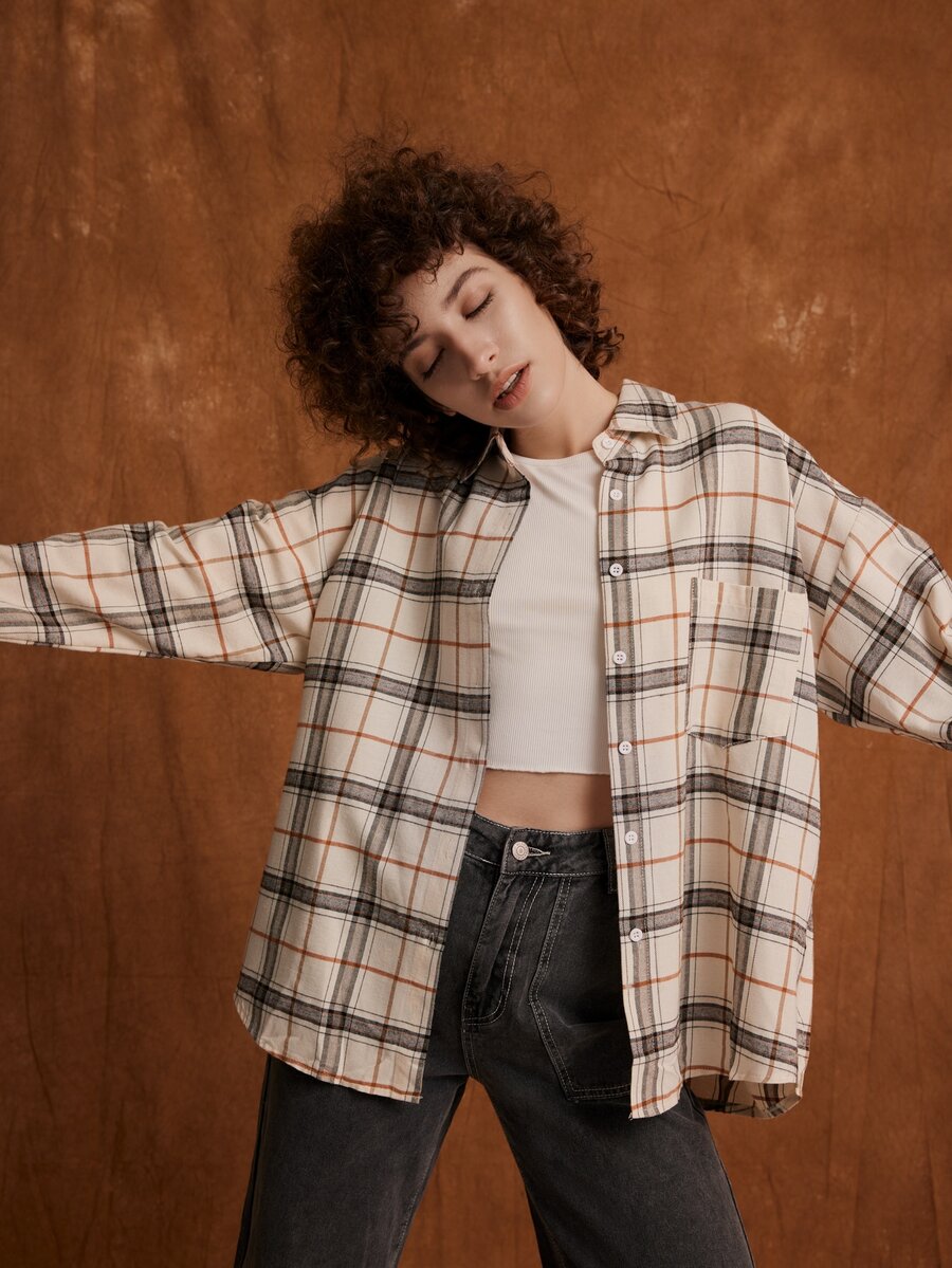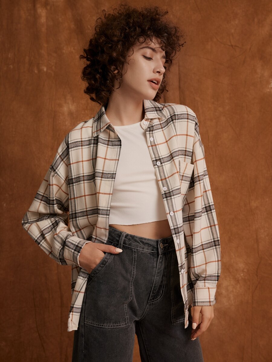 قميص مربعات ملونة منخفض الاكتاف مزينة بأزرار جيب امامي