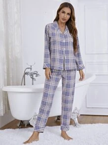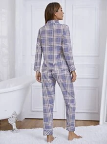 طقم ملابس ليلي طباعة مربع النقش مزينة بأزرار
