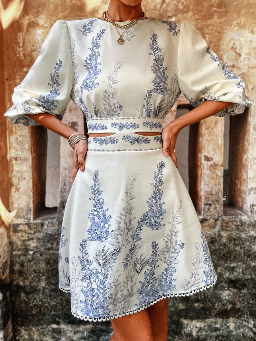 فستان بأكمام فوانيس مقصوصة ذو ربطات خلفية مطبوع بنقشات نباتية، ملابس صيفية للمرأة