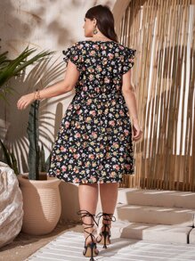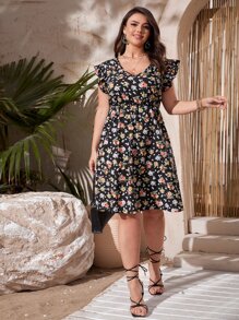 فستان باكمام مكشكش وبطباعة أزهار شامل مقاس كبير