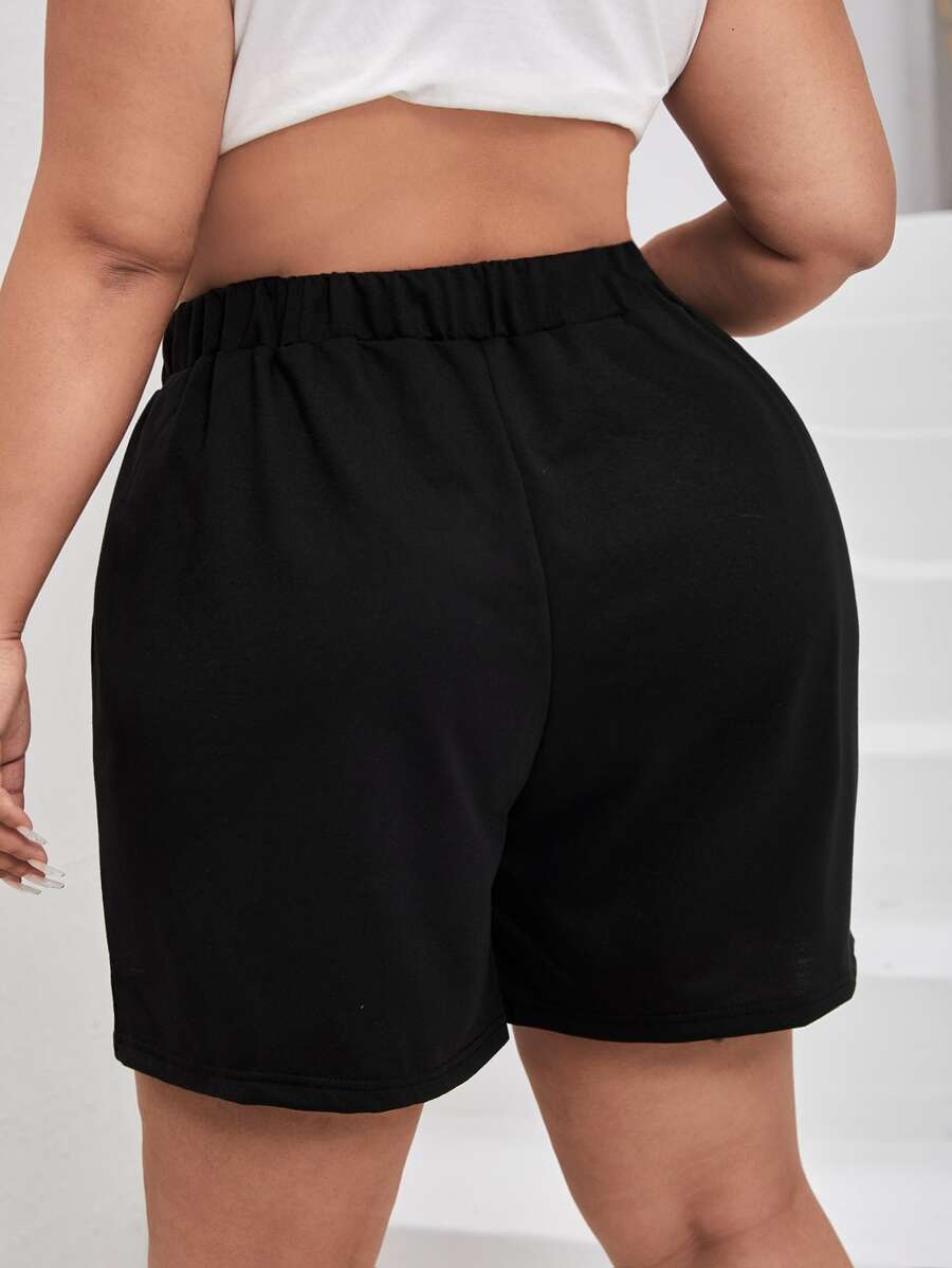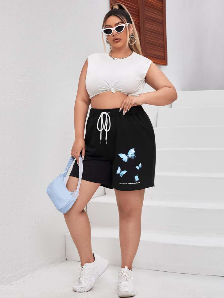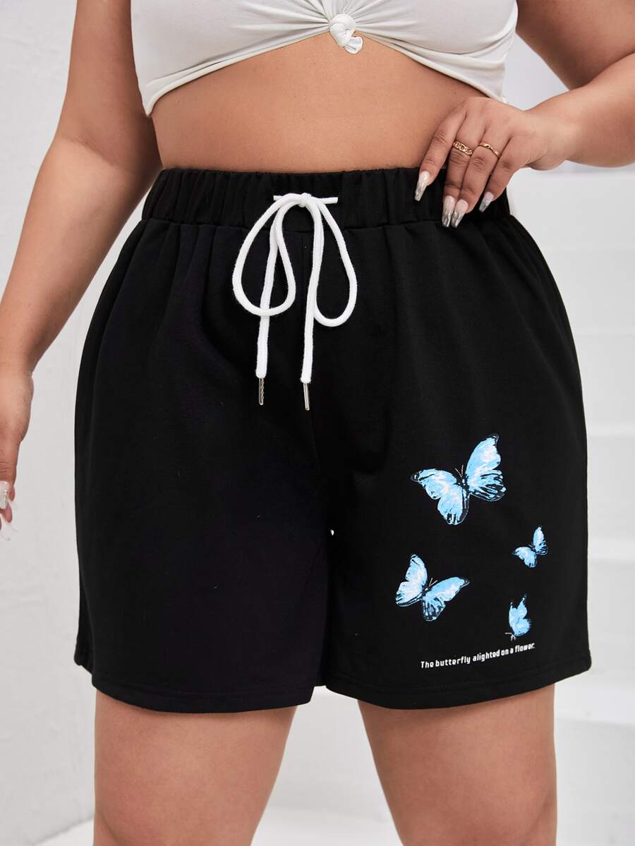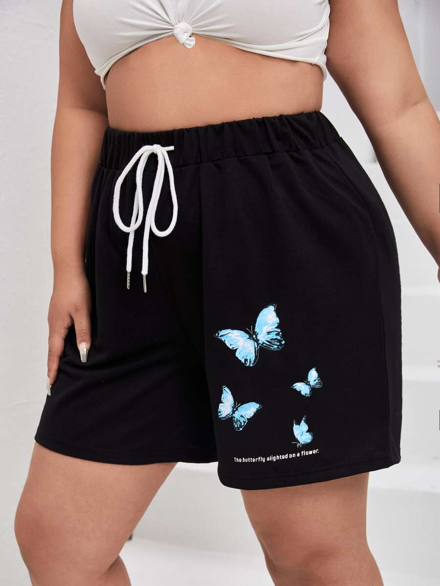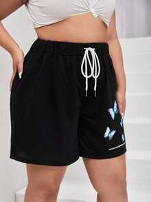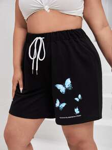 مقاس كبير شورت رياضي بجرافيك شعار وفراشة رباط خصر