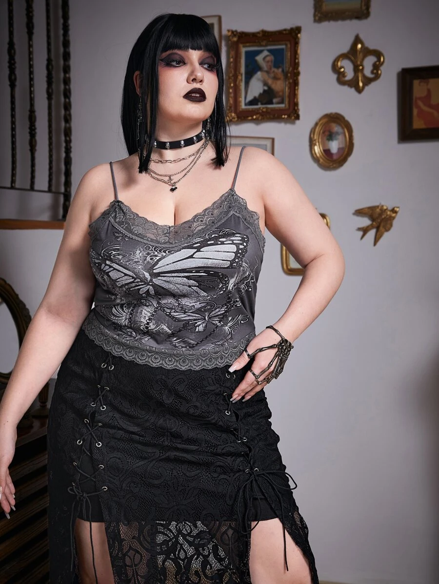 Goth صدرية كامي بطباعة الفراشة مقلم دانتيل مقاس كبير
