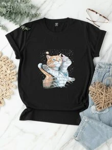 تي شيرت بطباعة المجرة وقط مقاس كبير
