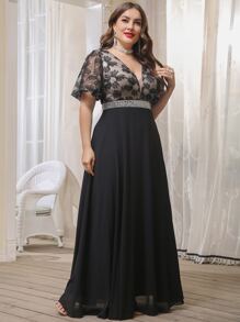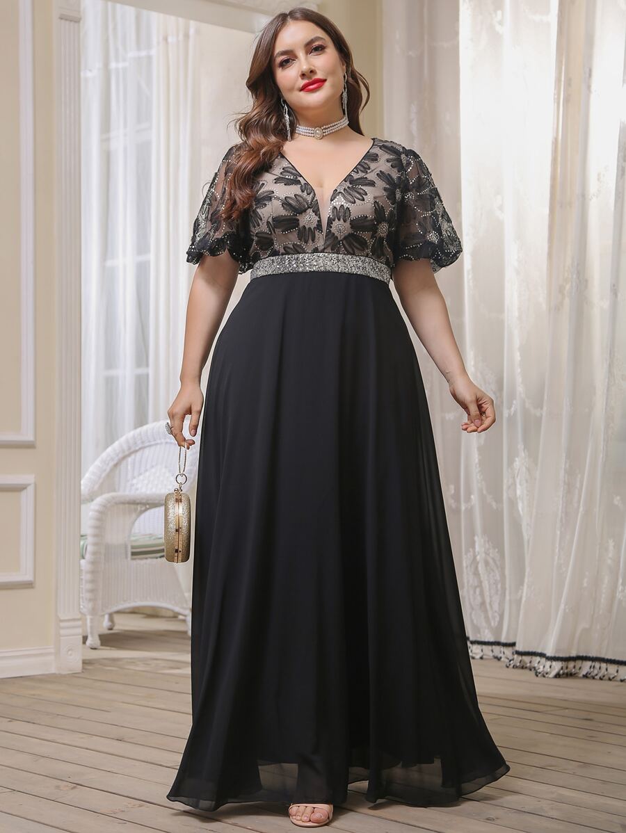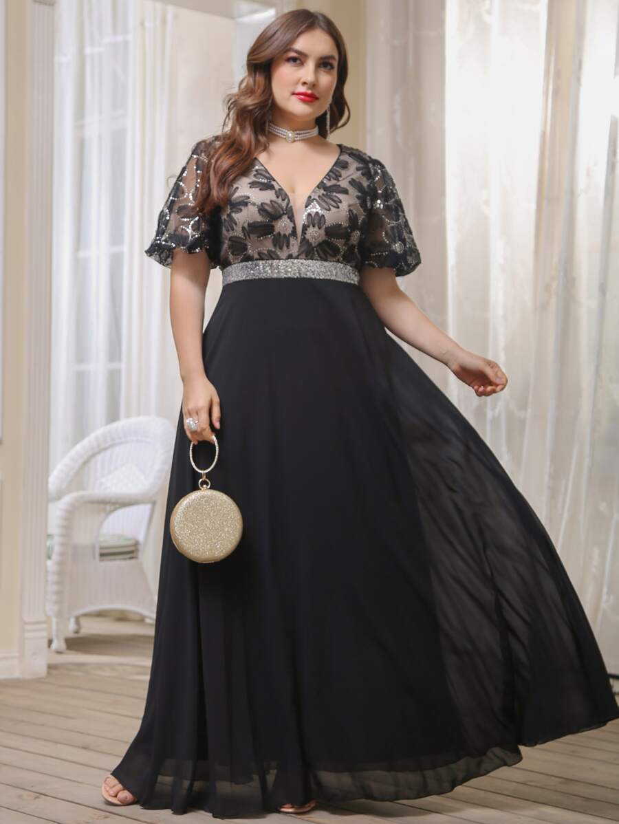 فستان كاجمولسي للسهرات والأحداث الرسمية الأناقة بتفاصيل من الشيفون والترتر والشبك باللون الأسود، مناسب للحفلات والسهرات الرسمية كالحفلات وحفلات التخرج والعشاء
