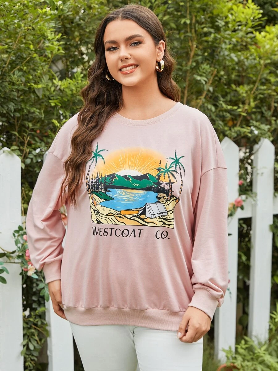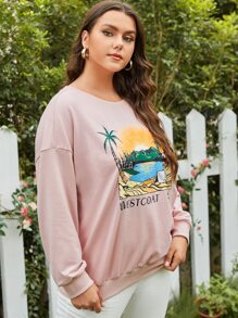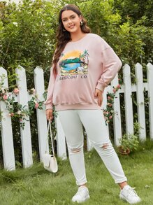 مقاس كبير قميص ثقيل بجرافيك عبارة وشجرة جوز الهند منخفض الاكتاف