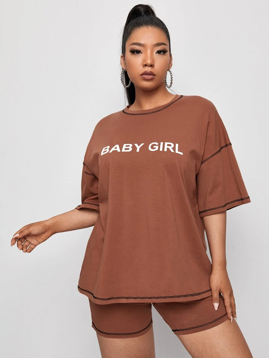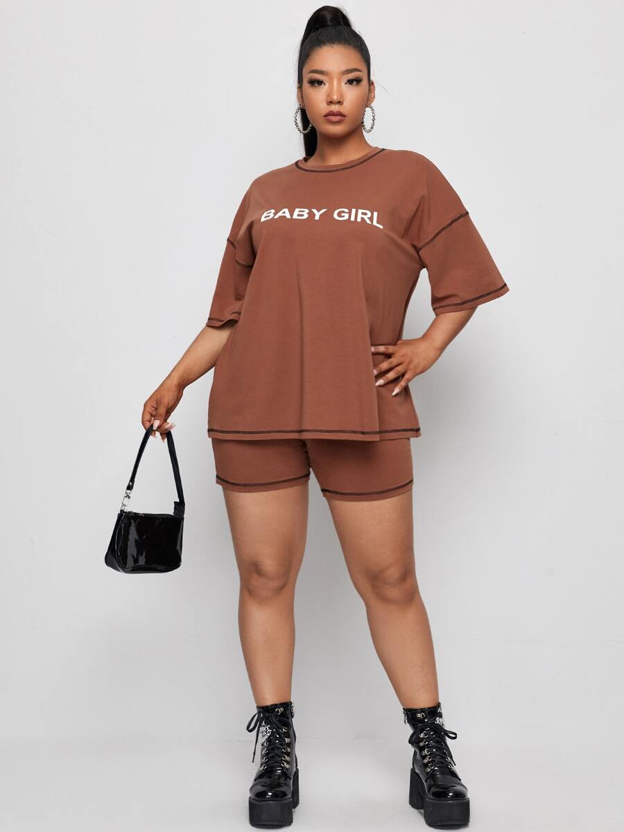 طقم سروال قصير بيكر مقاس كبير مع لباس علوي بجرافيك عبارة بغرز متباين