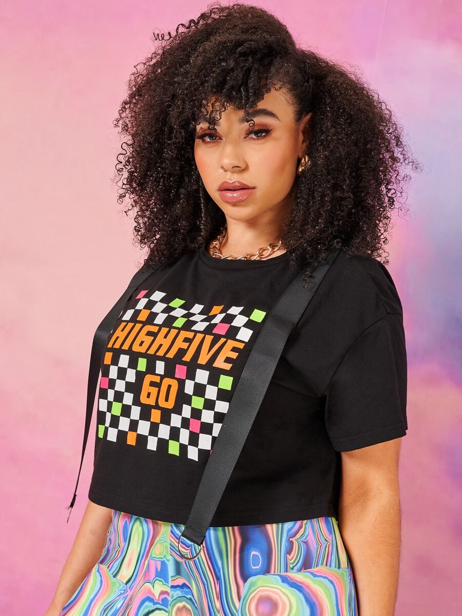 تي شيرت بطباعة هندسي وعبارة بتفاصيل متدلي وبحلقة D مقاس كبير