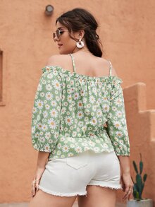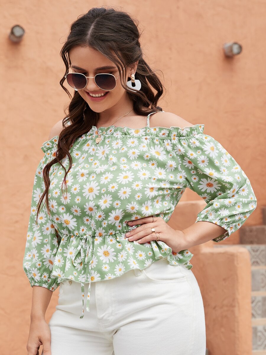 بلوزة بحافة مكشكش وبطباعة زهر اقحوان مقاس كبير