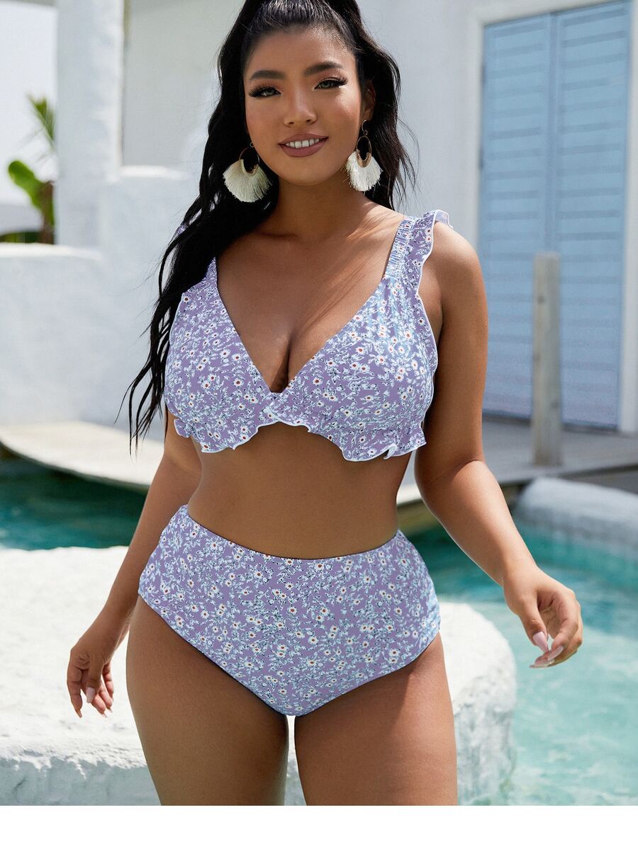 طقم بكيني عالي الخصر بطبعة زهور متداخلة المقاسات الكبيرة للصيف والشاطئ