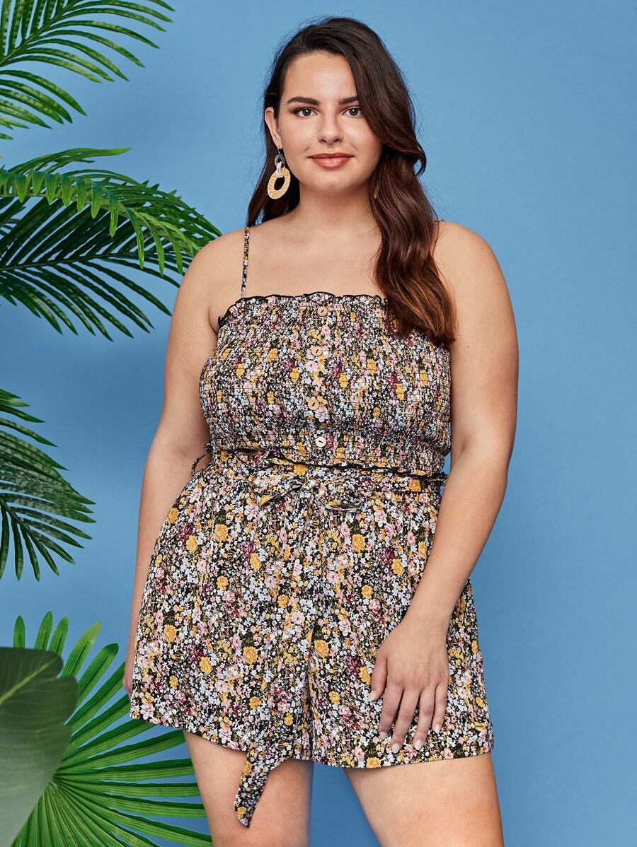 مقاس كبير زهر ديزي مقلم نمط نبات الخس بغرز صدرية كامي قصير و خصر عالي بالتجاعيد شورت بحزام طقم