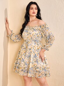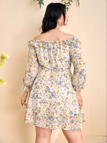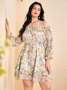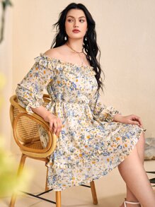 مقاس كبير فساتين ازهار ديزي كتف مكشوف حافة مكشكشة