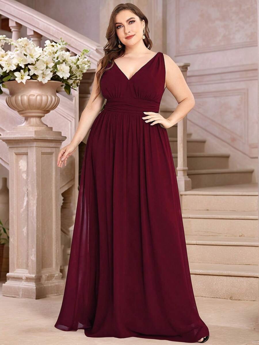 فستان سهرة أنيق بياقة على شكل حرف V مزدوج وخصر مطوي بدون أكمام، فستان وصيفة العروس باللون البرغندي الأنيق، فساتين رسمية لحفلات الزفاف والضيوف في الربيع والصيف، فستان للعطلات