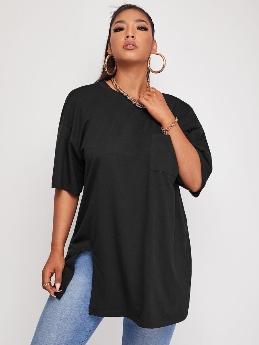 تي شرت بخط طويل مشقوق امامي ومنخفض الاكتاف مقاس كبير