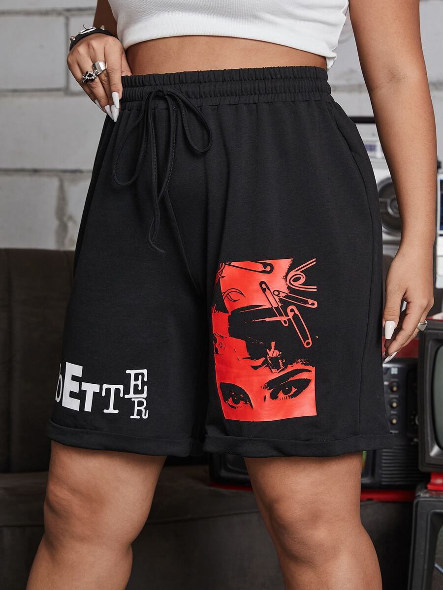 مقاس كبير بنطلون قصير بجرافيك عبارة وشخصية