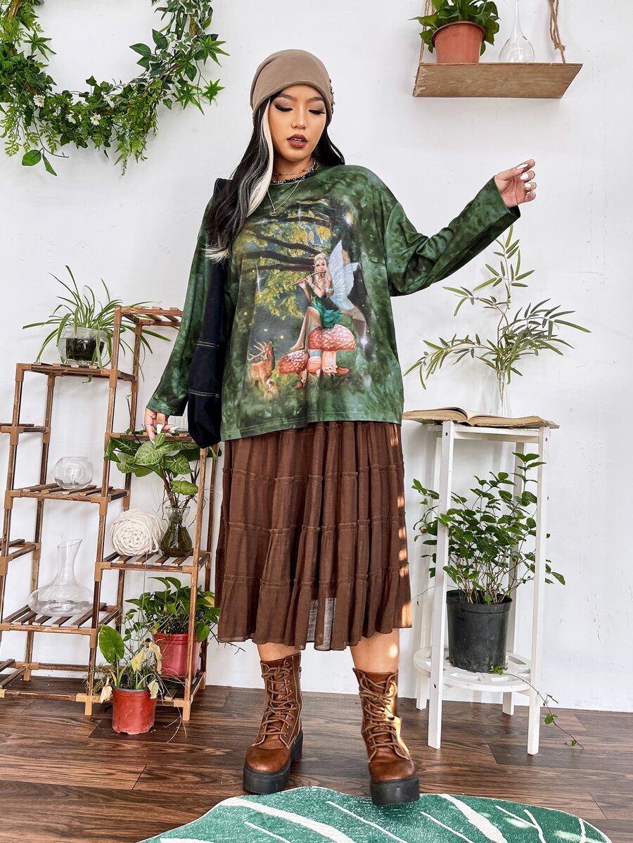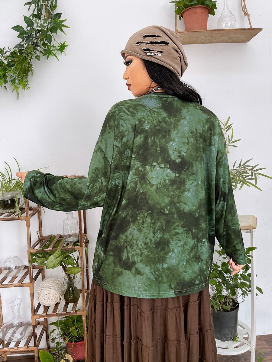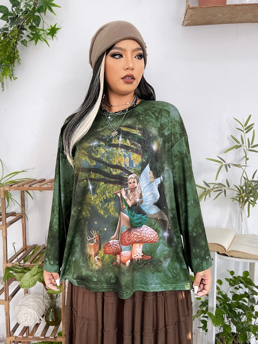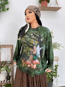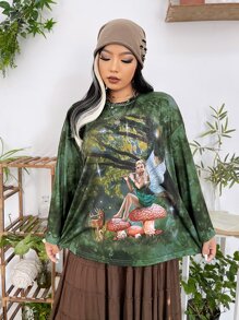 تي شيرت منخفض الاكتاف شكل و طباعة حيوان صبغ متعادل مقاس كبير