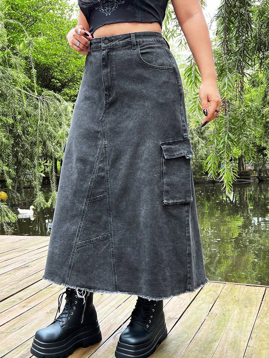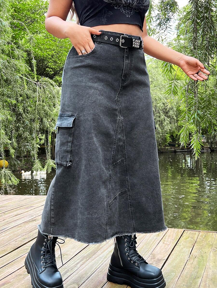 تنورة دنيم جيب جانبي قلاب حافة خام بدون حزام مقاس كبير