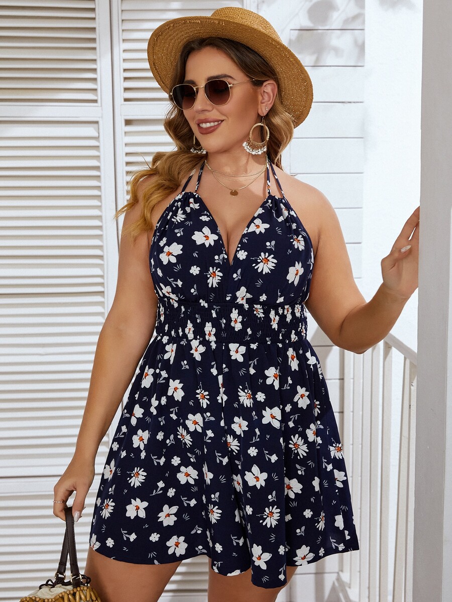 مقاس كبير رومبير برسن طباعة الأزهار مكشوف الظهر خصر مدرز