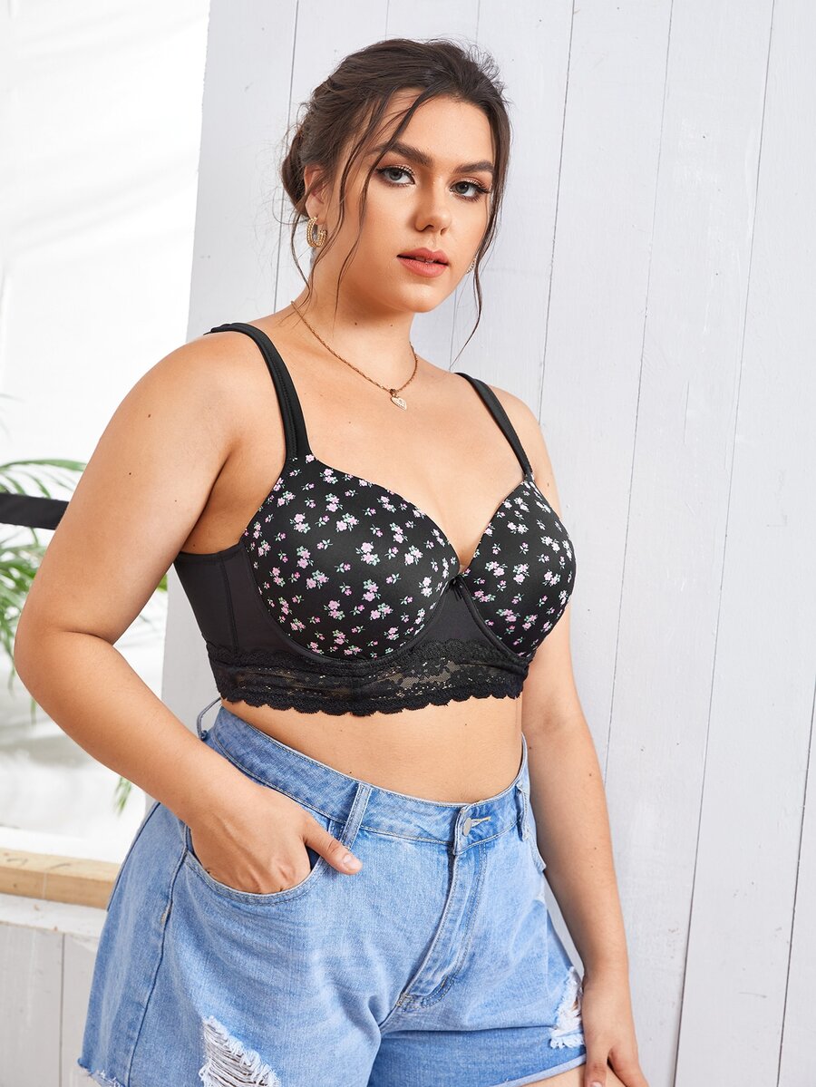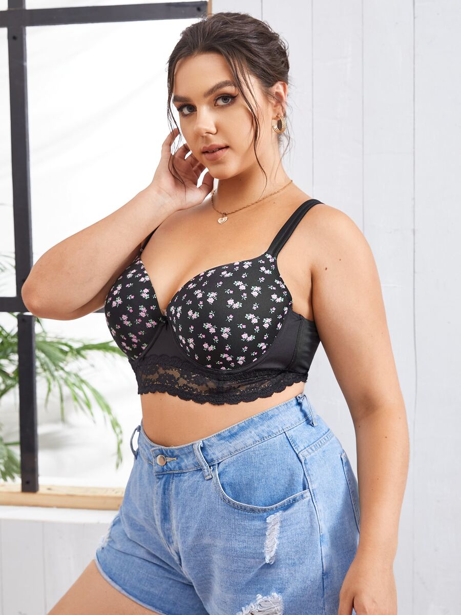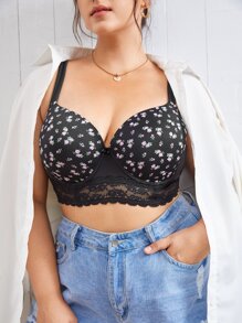 حمالة صدر داخلية بدانتيل متباين وبطباعة زهر مقاس كبير