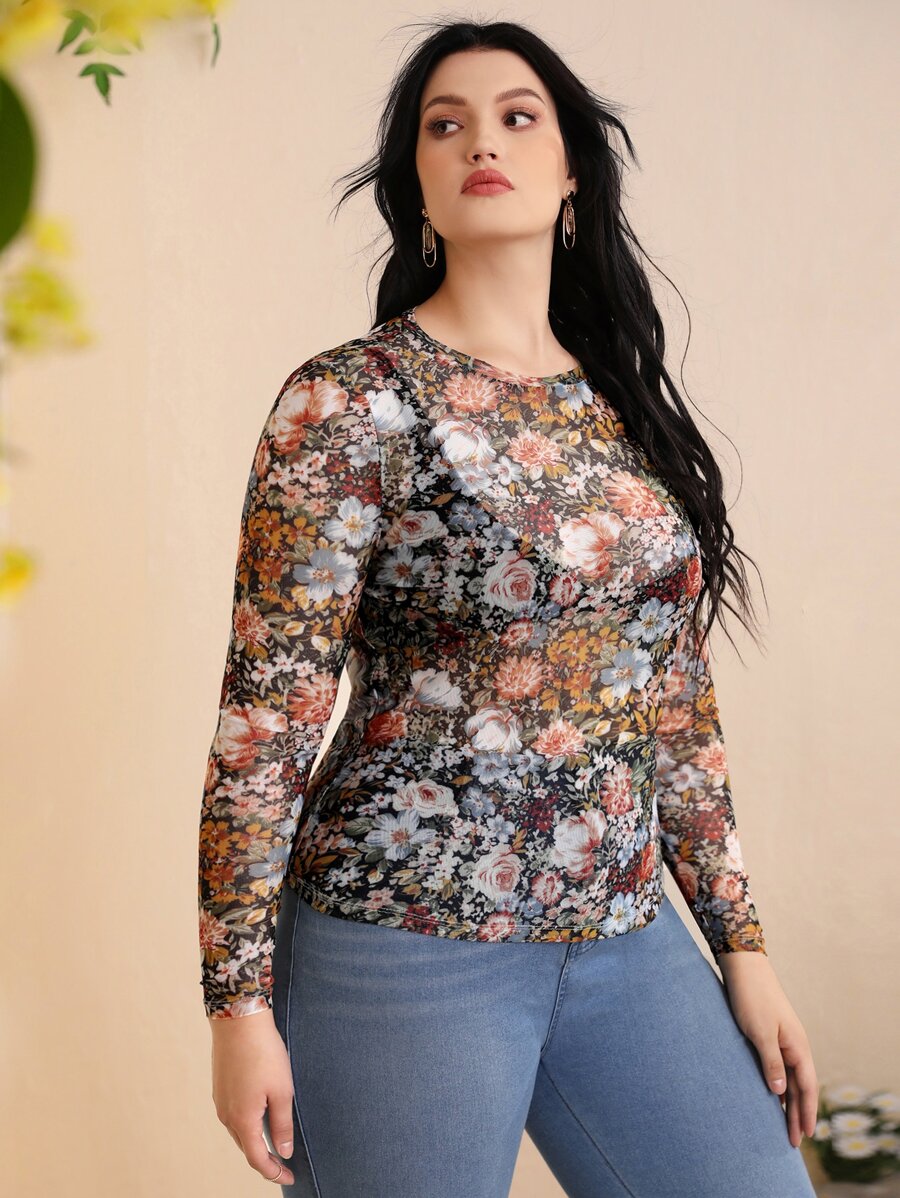 مقاس كبير ملابس علوية طباعة الأزهار شبكة