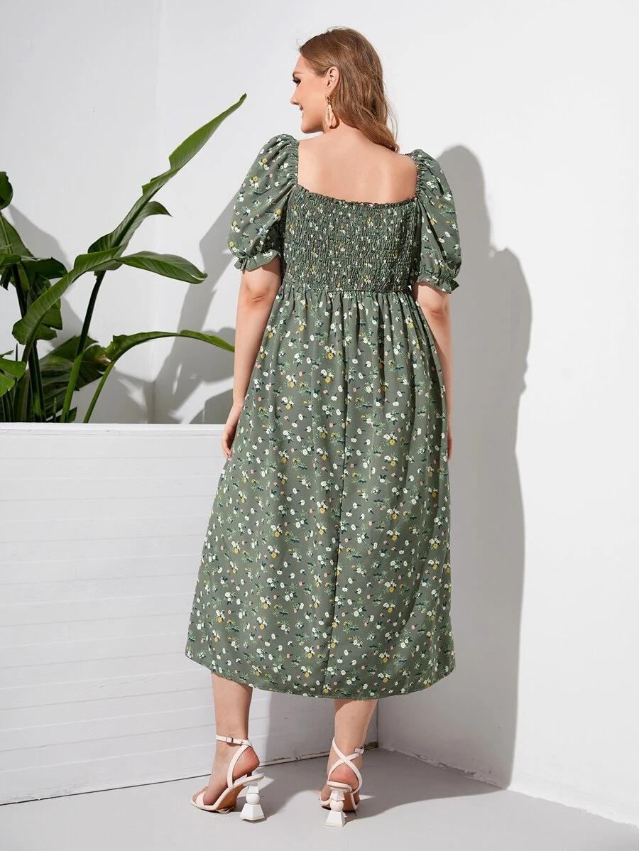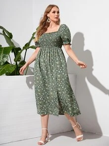 فستان بفخذ مشقوق مكشكش وبطباعة زهر مقاس كبير
