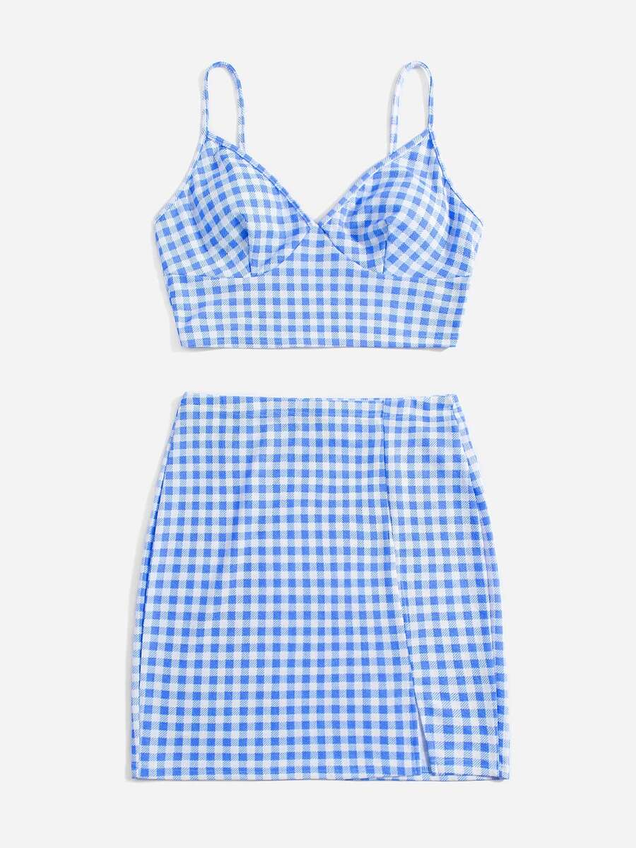 مقاس كبير بطباعة مربعات غنغهام بوستير لباس علوي كامي قصير مع فتحة طقم تنورة