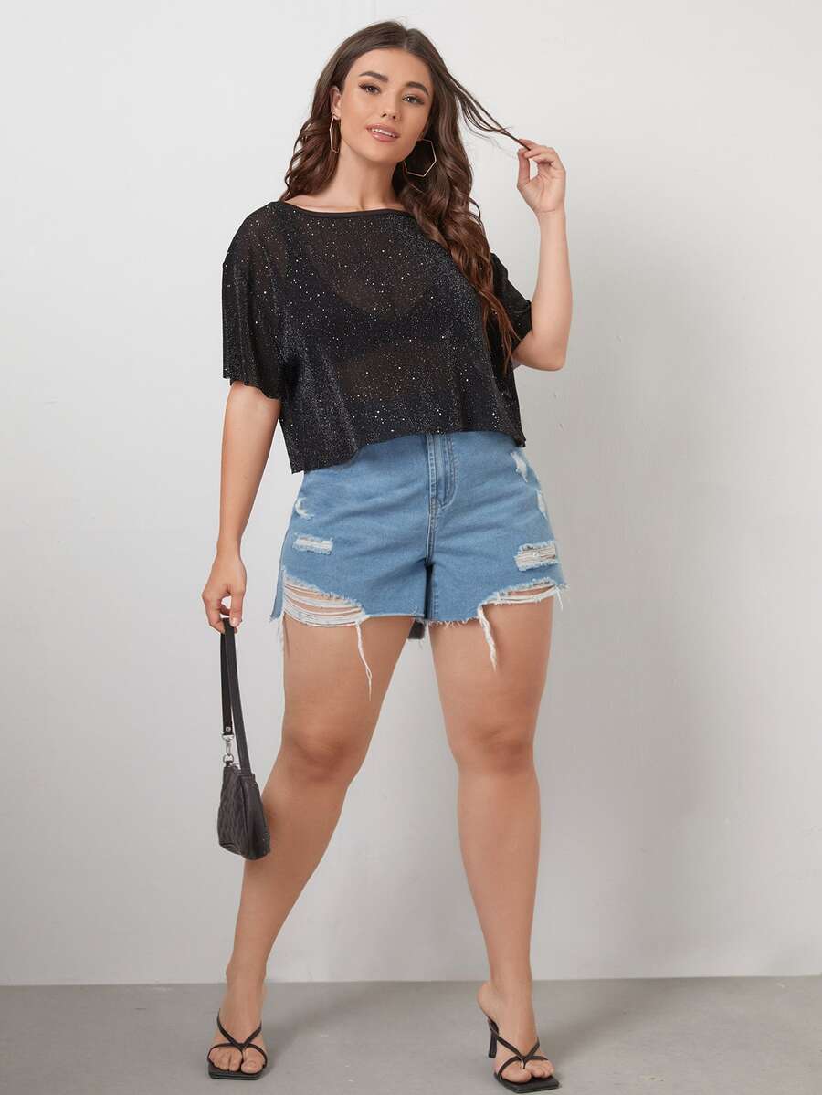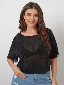 لباس علوي شفاف قصير منخفض الكتف براق مقاس كبير