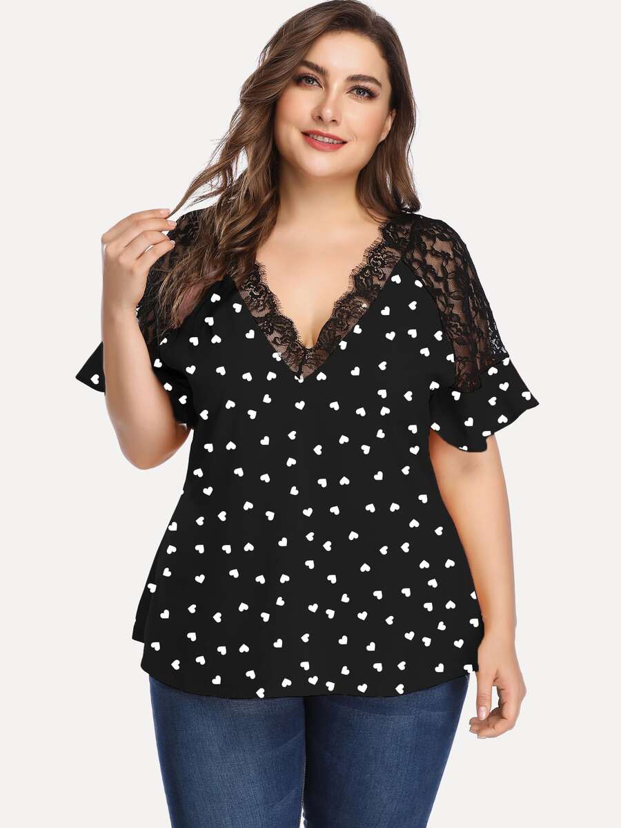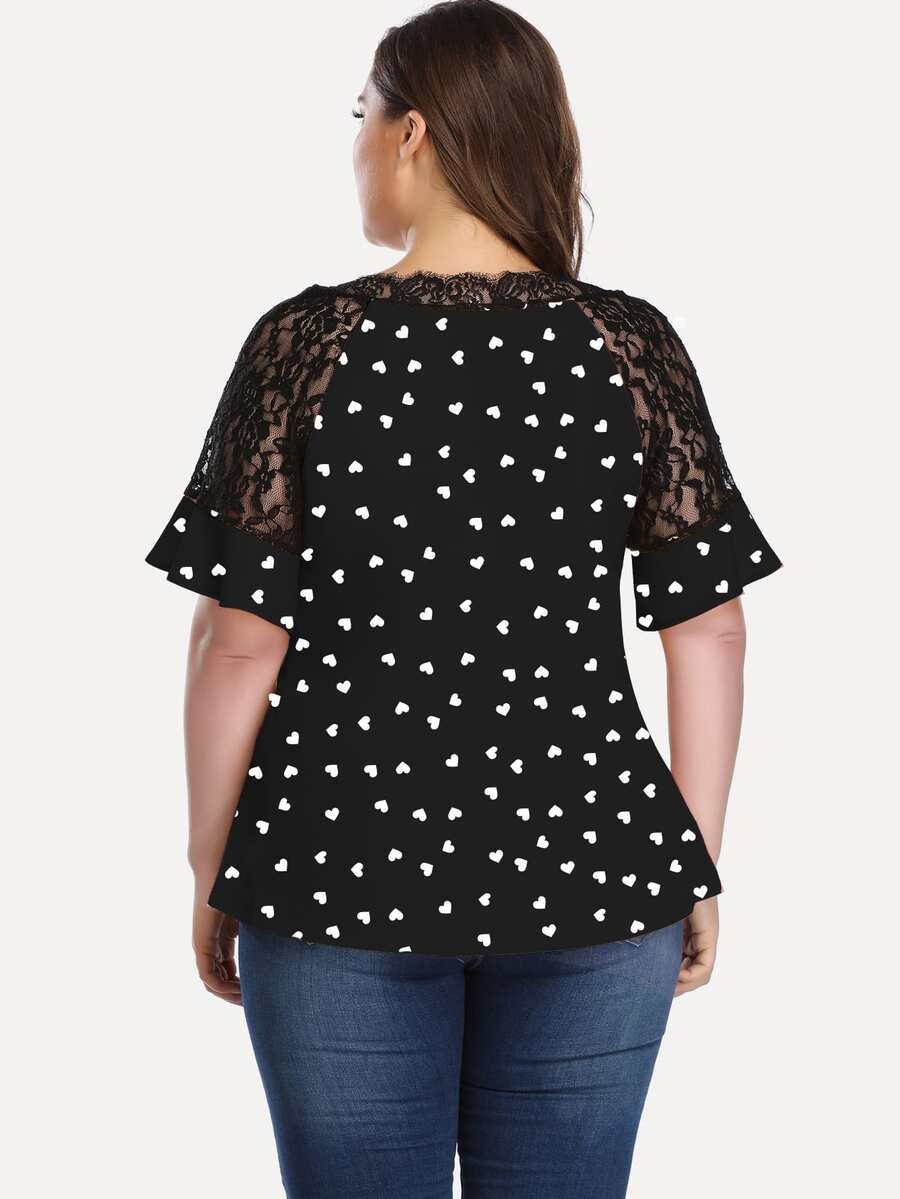بلوزة باكمام مكشكش دانتيل متباين وبطباعة قلب مقاس كبير