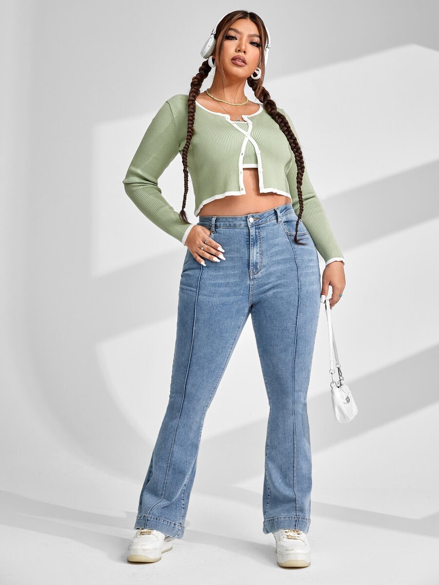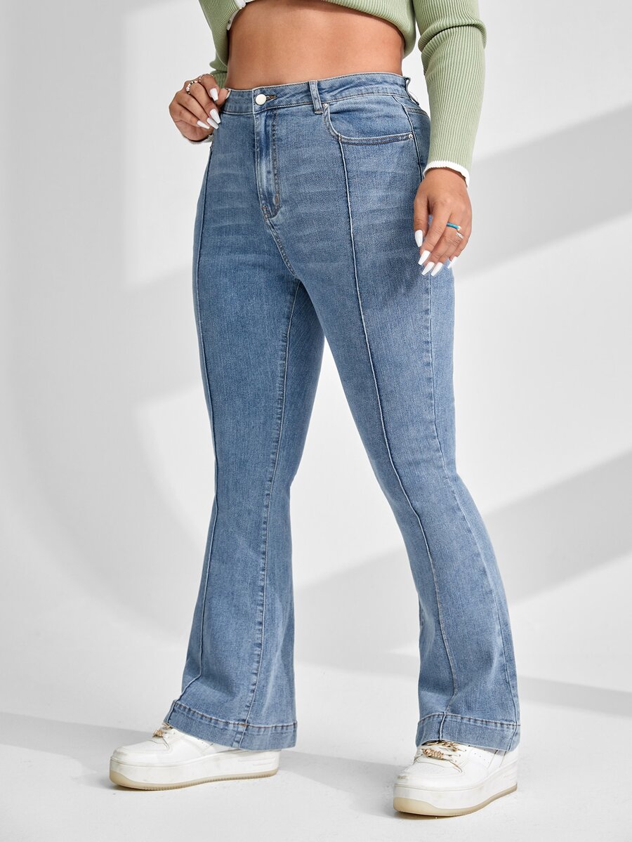 بنطلون جينز واسع من الاسفل خصر عالي مدرز تفاصيل مقاس كبير