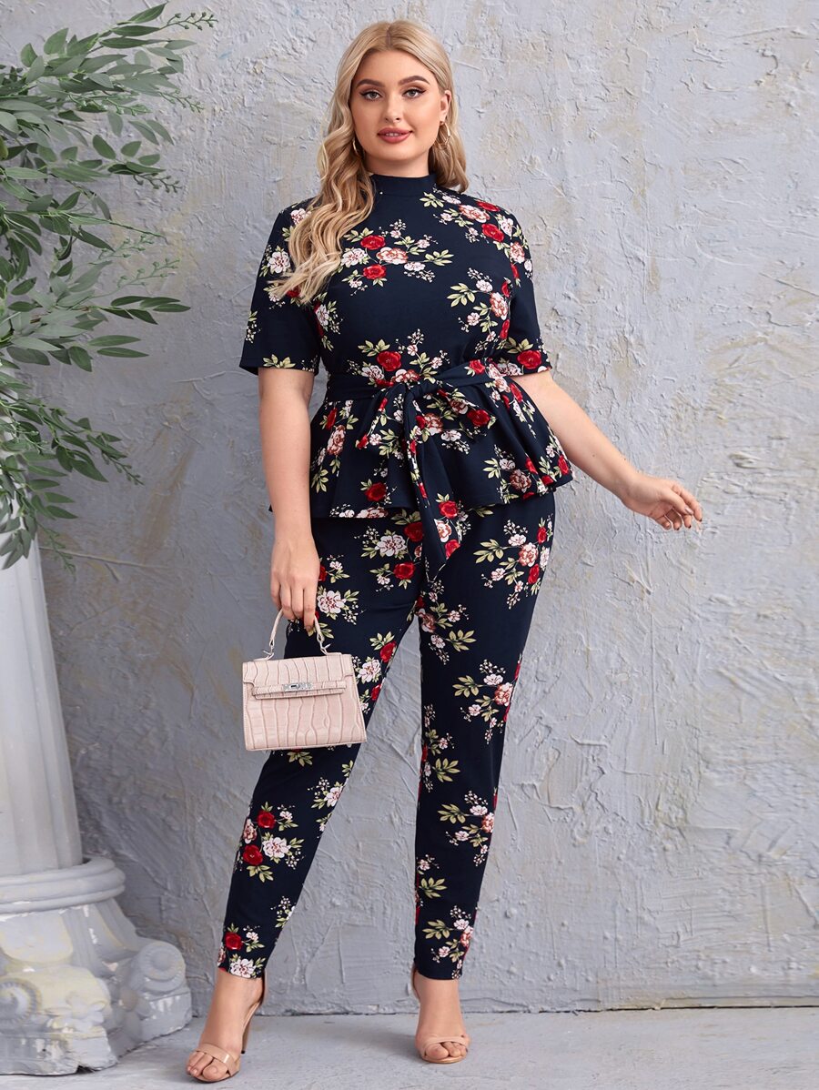 طقم طماق مع لباس علوي مزهر بحزام وبياقة دائري مقاس كبير