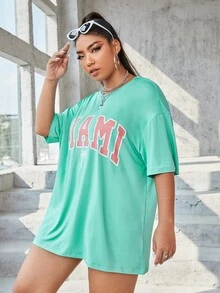 تي شيرت منخفض الاكتاف بجرافيك شجرة نخيل وعبارة مقاس كبير