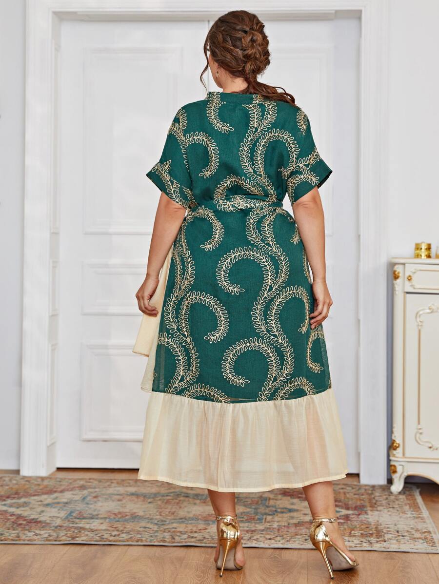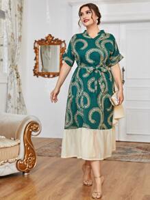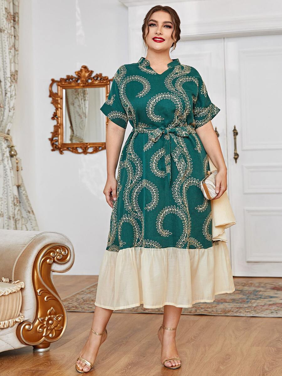 فستان بحزام بحافة مكشكش بطباعة نباتات مقاس كبير