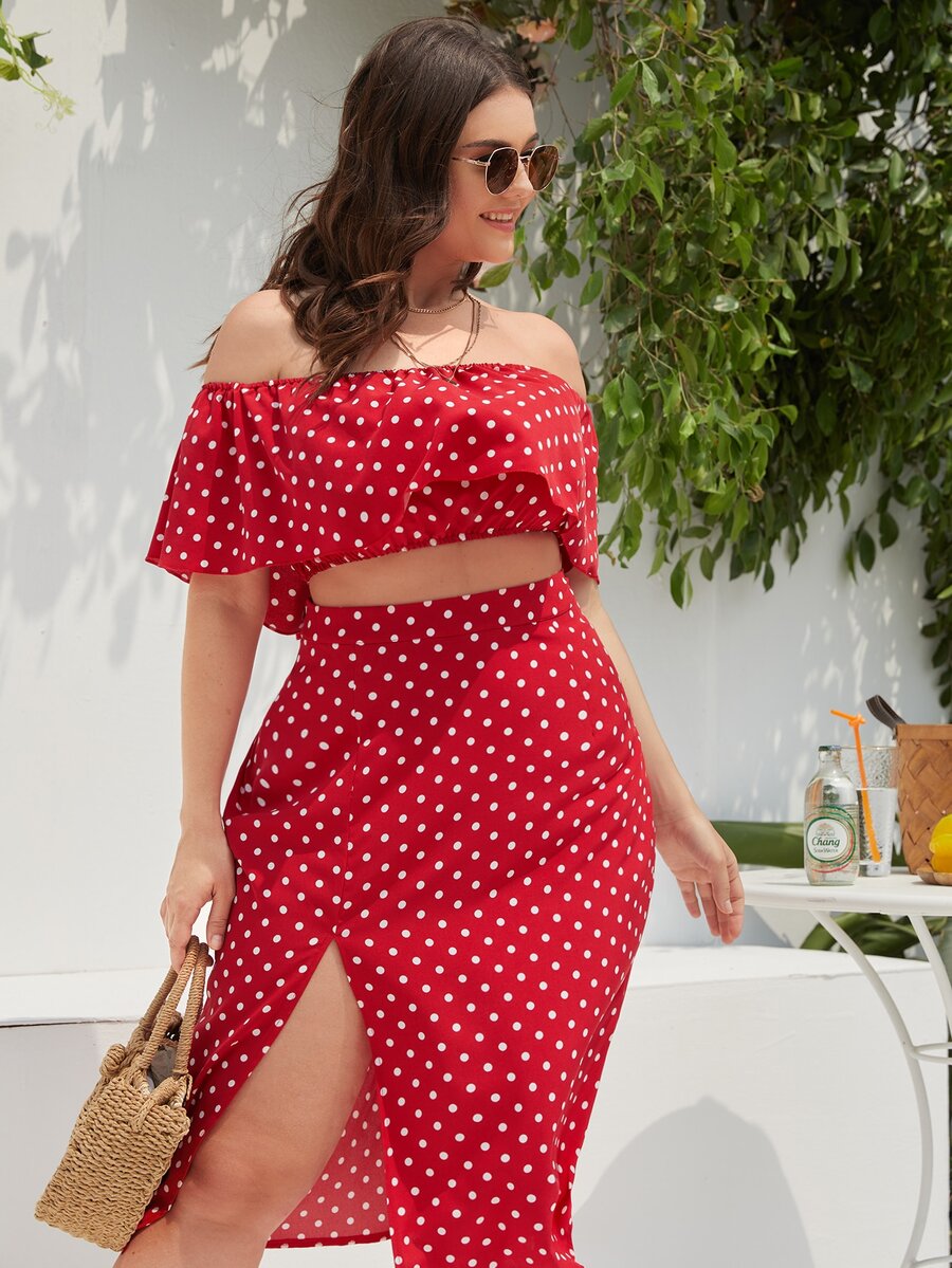 لباس علوي مكشوف الكتف بنقاط البولكا مقاس كبير مع تنورة بفحتة