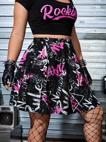 تنورة واسع من الاسفل موسيقى الروك بطباعة غرافيتي بدون حزام مقاس كبير