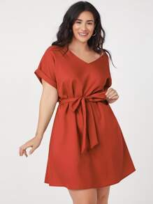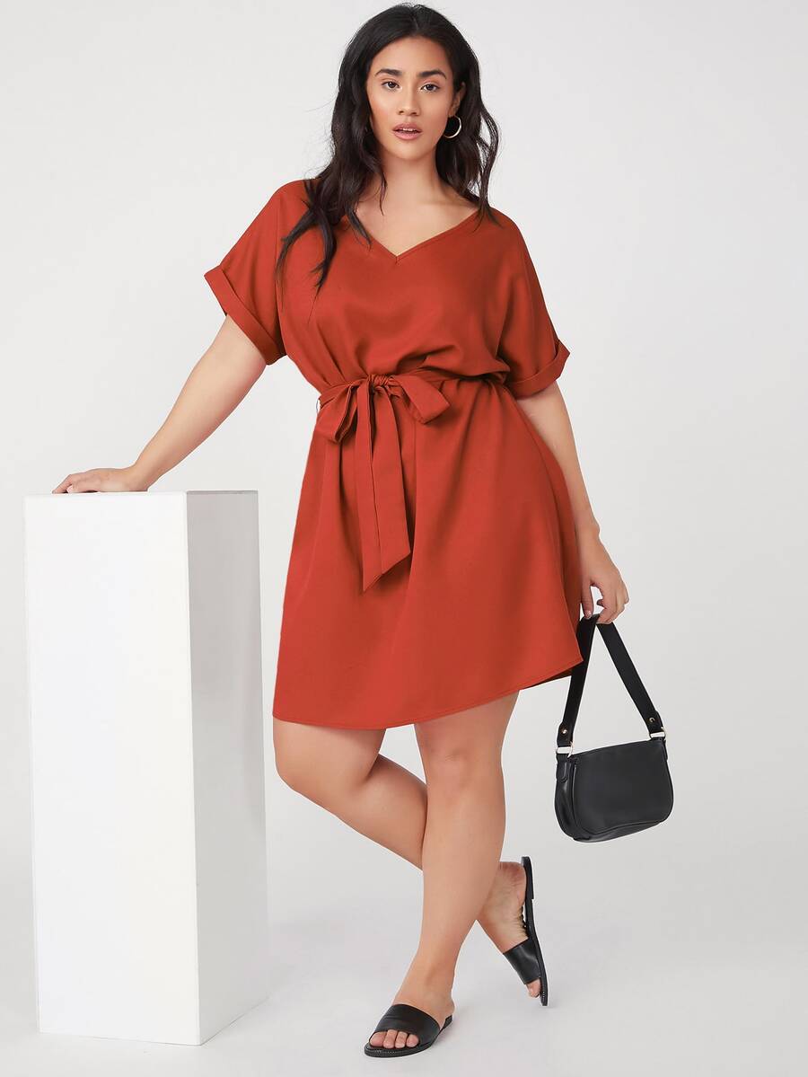 فستان بحزام بلون موحد وباكمام ملفوف مقاس كبير