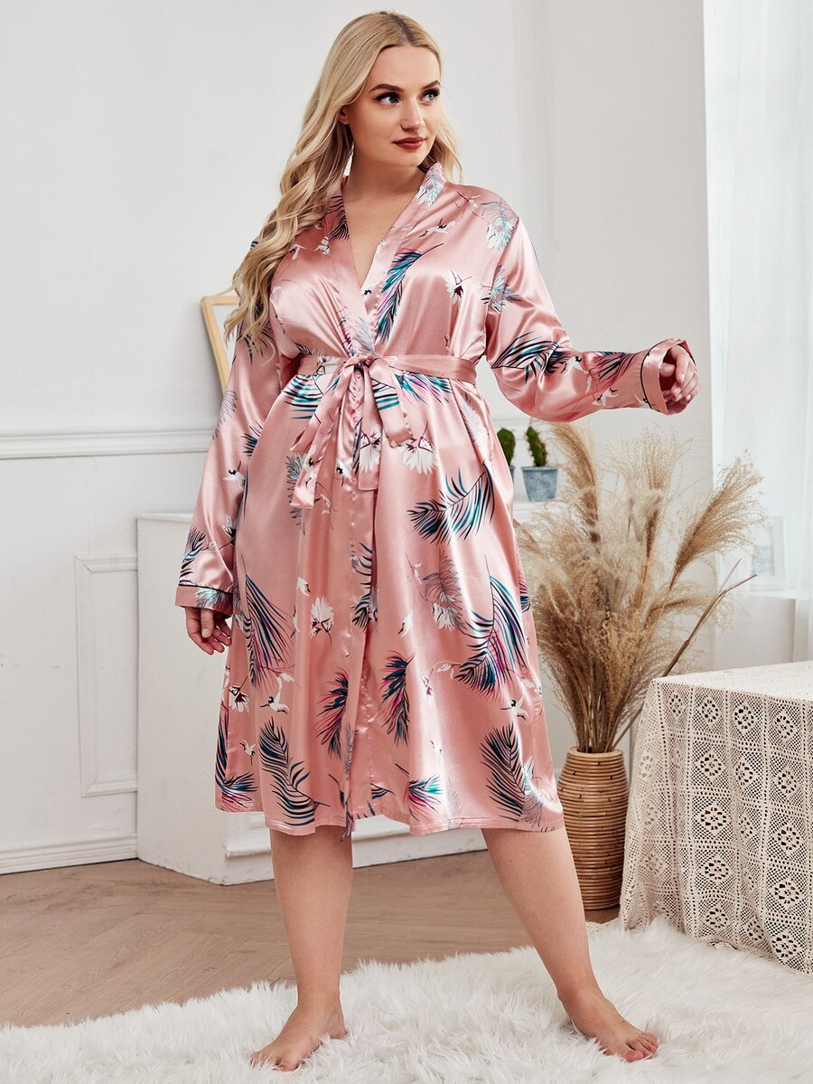 روب مقاس كبير بحزام بطباعة إستوائي و رافعة ساتان